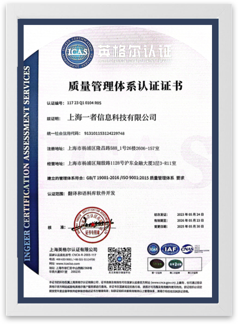 上海一者信息科技有限公司是以自主研发技术为驱动的国家高新技术企业,在大模型融合翻译、多语言大数据检索分析、人工智能机器翻译、自然语言处理、多文件格式解析等多项技术领域处于国内外领先水平,产品包括YiCAT在线翻译管理平台、YiLOC本地化管理平台、YiCorpus多功能语料库检索平台、YiSight区域国别研究平台、语料在线对齐、改写匠英语写作智能批改平台等,在上海、南京、北京、深圳、郑州、武汉、长沙等地设有办公室和办事处,是行业专业的智能翻译与本地化技术解决方案提供商。